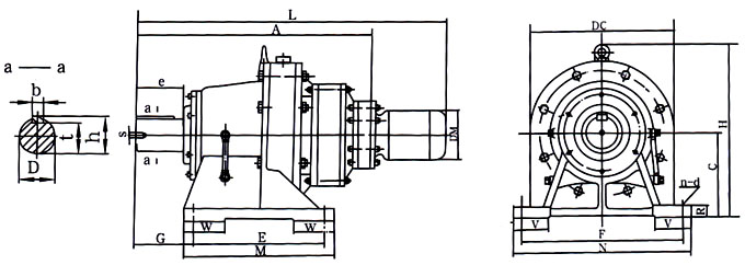 注:1、表中所列尺寸單位為毫米,重量單位為千克,功率單位為千瓦。 2、所用電動機為Y系列及YA增安型,配YB,YEJ,YCT電動機與公司方聯(lián)系。 3、D軸徑配合為h6。 4、B系列安裝尺寸參照單級尺寸。 |